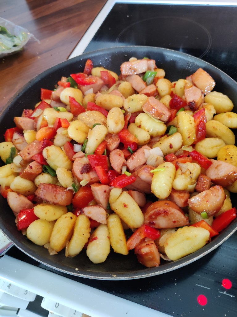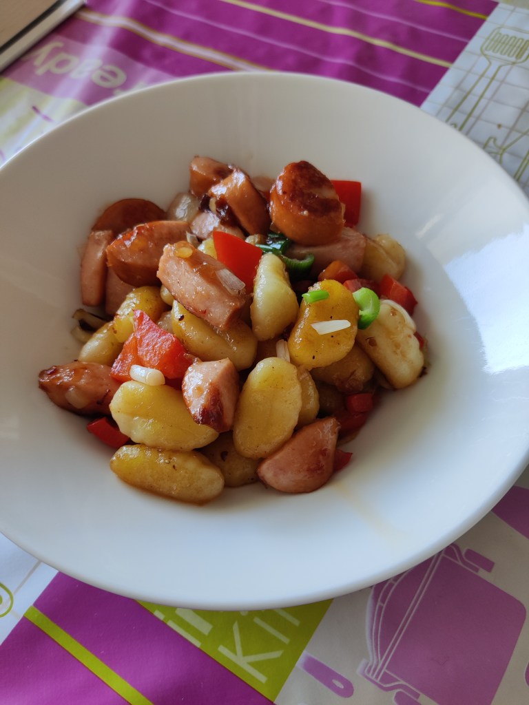 Tässä versiossa käytin paketin gnocceja, purjoa 10 cm, punaista paprikaa 1kpl pilkottuna ja hyvää grillimakkaraa paketin, kun oli jostain jäänyt käyttämättä (ilmeisen grillauksesta…). Paistamiseen ruokaöljyä ja maustoin koko paketin omena-savu bbq- kastikkeeella, antoi sopivasti makua ja vähän tahmaa ”kastikkeeksi”. Gnocchit ovat aika kuivia itsessään, jotan kaipaavat hyvää maustamista