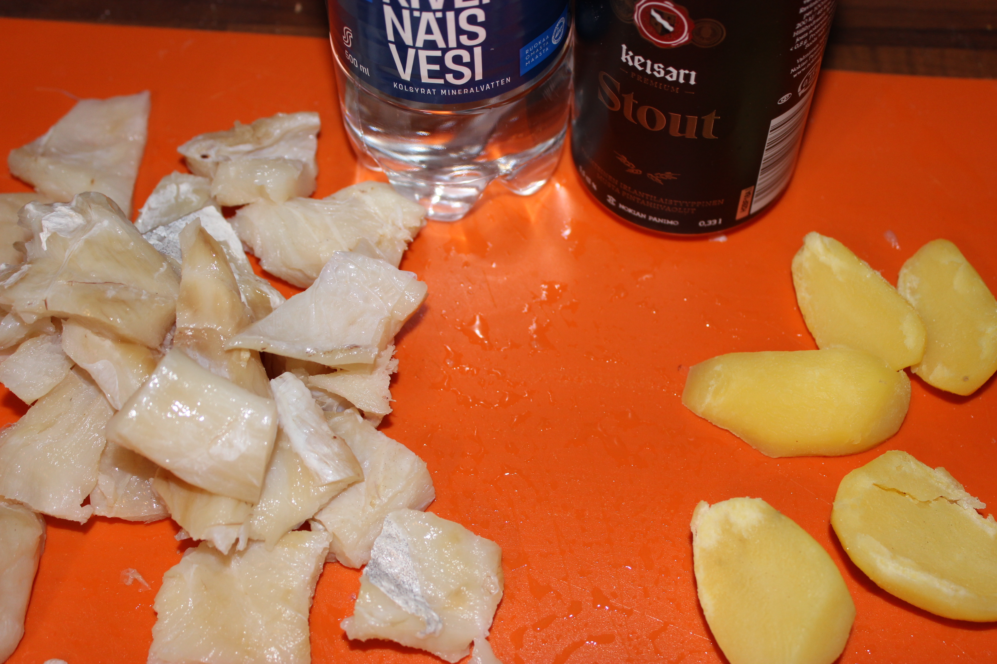 Käytin reseptiä jossa on tummaa olutta ja kivennäisvetä panerointitaikinassa. Itse en ole kovin oluen ystävä, muta ruuanlaitossa nämä toimivat. Oikein asioikseen piti mennä lähikauppaan olutostoksille ja tumma olut antaa taikinaan makua ja väriä. Maissitärkkelys ja leivinjauhe tekee siitä kuohkeaa poreilevan kivennäisveden kanssa