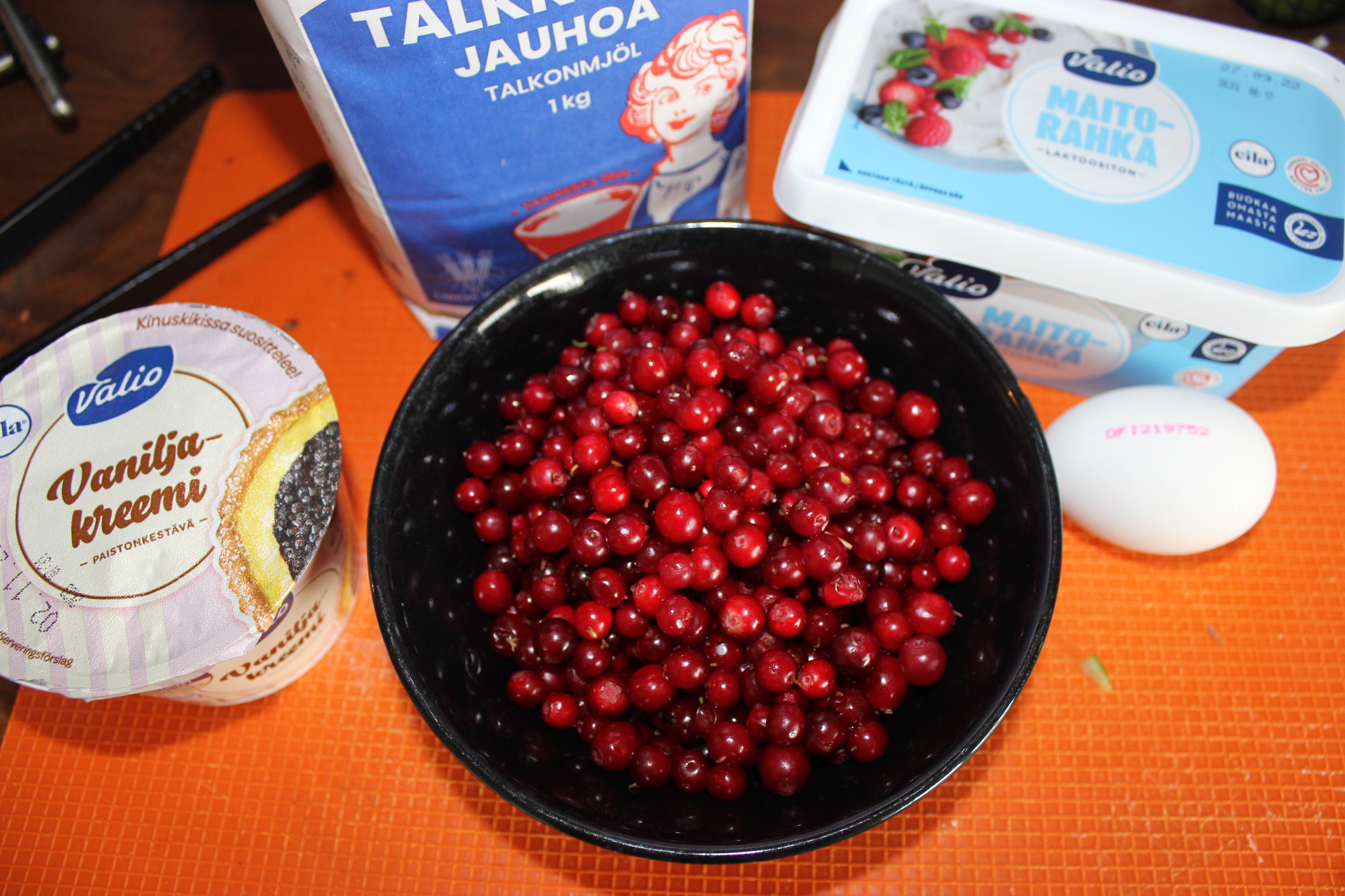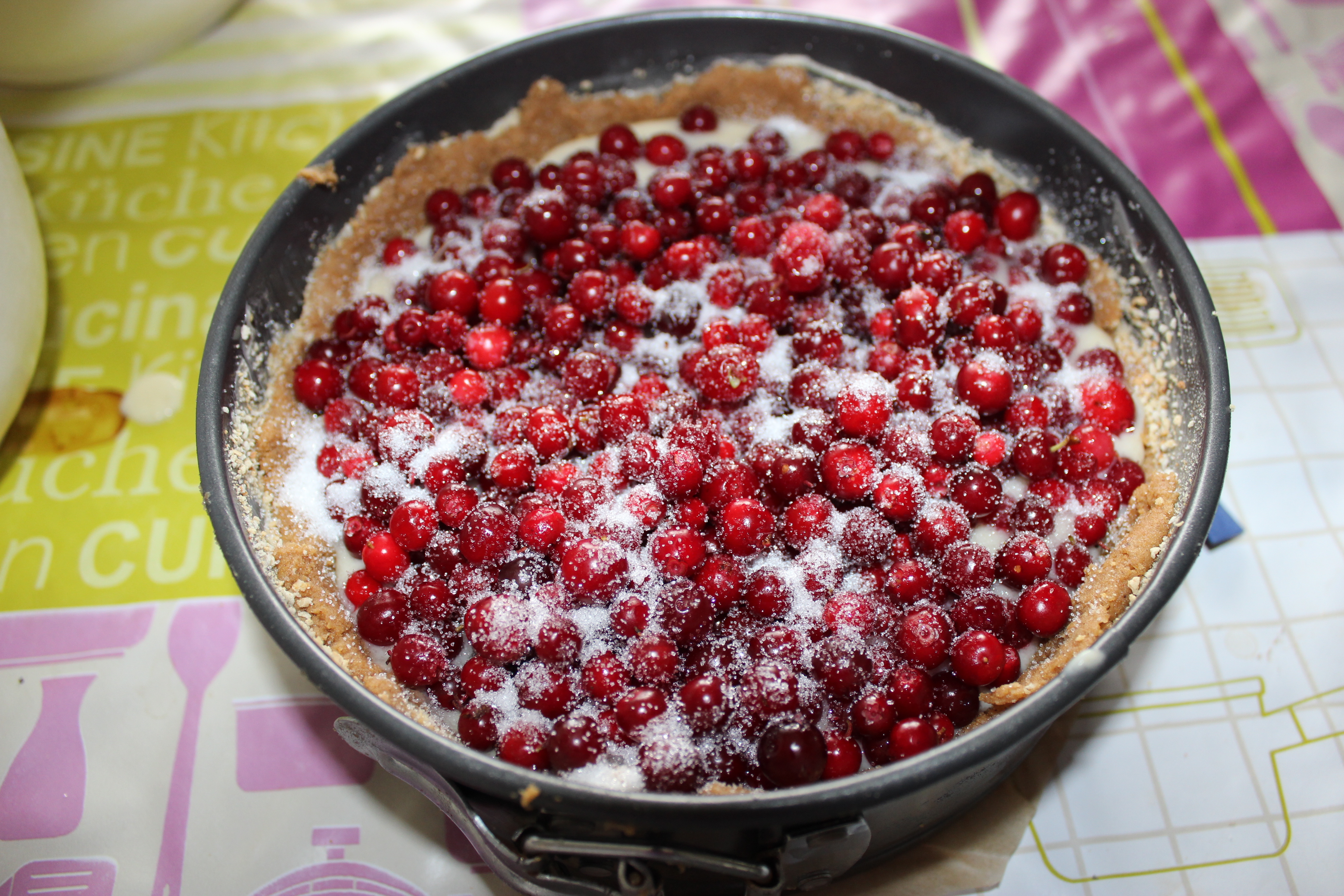 Sekoitin täytteeseen maitorahkaa ja Valion uutta vaniljakreemiä, 2 dl verran molempia, noin 0,5 dl sokeria ja 2 tl jauhettua inkivääriä ja yhden kananmunan. Tämä seos sitten pohjanpäälle. Pinnalle paksu kerros tuoretta puolukkaa, ehkä noin 2,5 dl ja sokeria. Uunissa tunnin verta 175 asteessa. Puolukka ja talkkuna toimi todella hyvin yhteen!