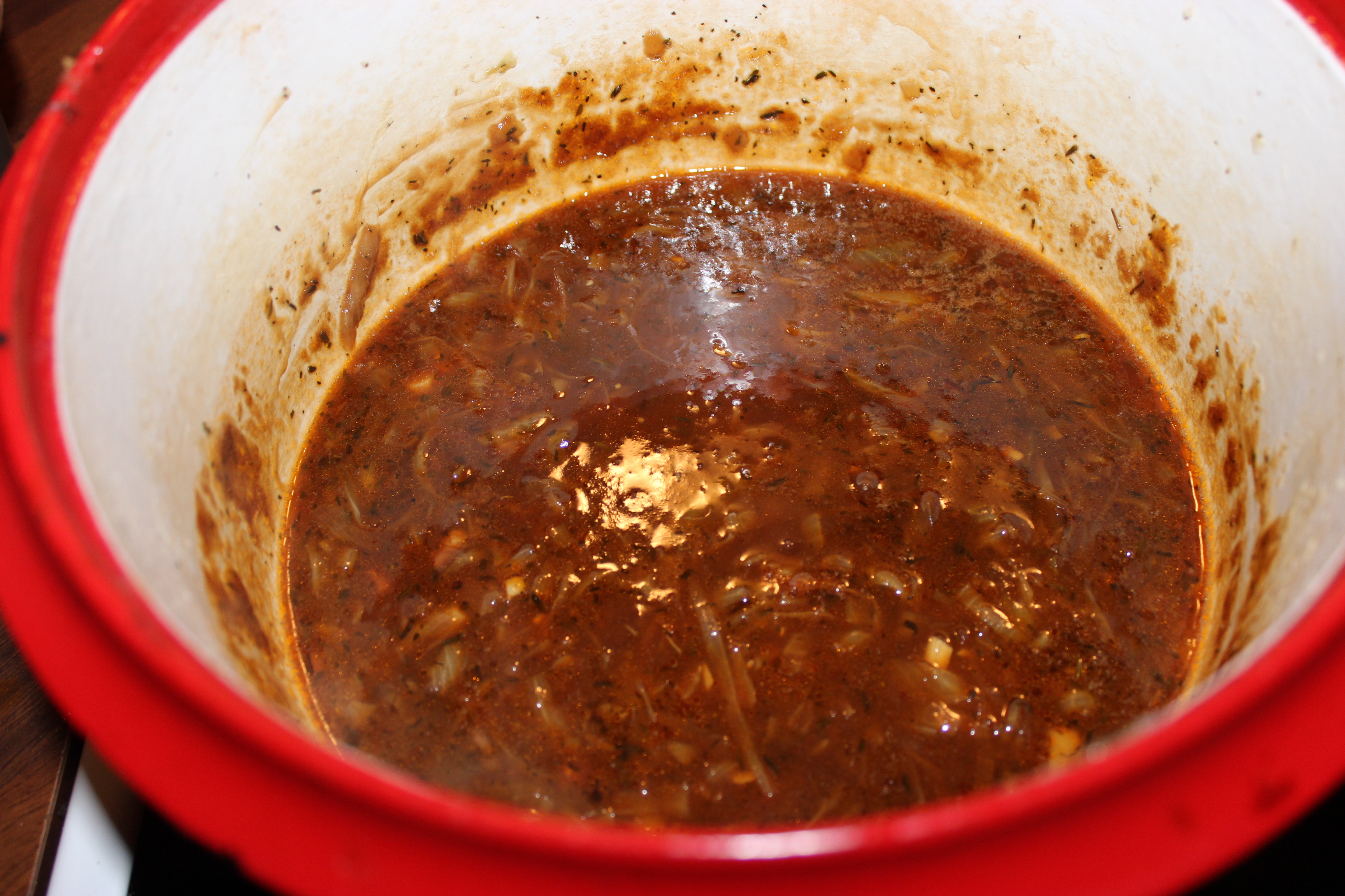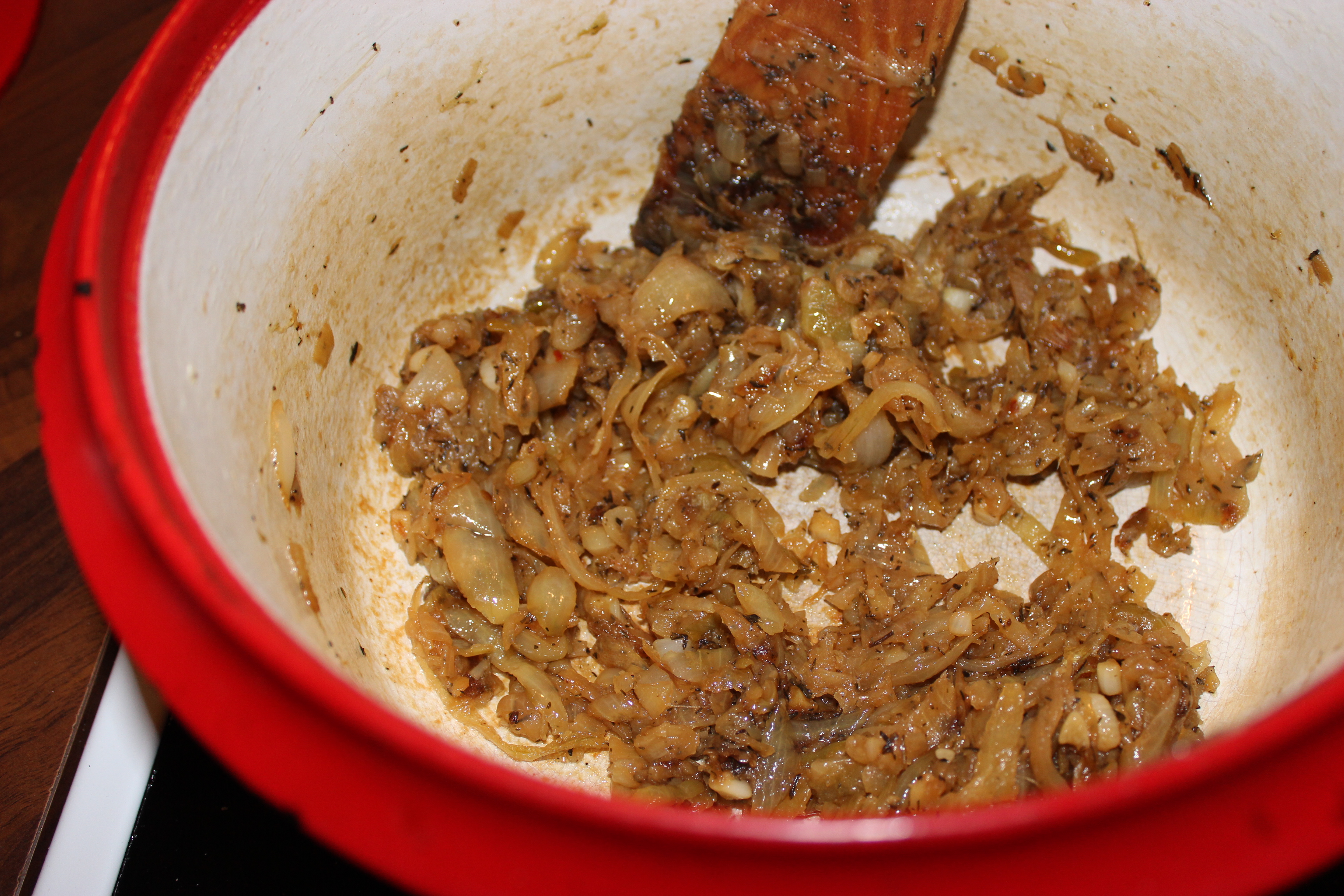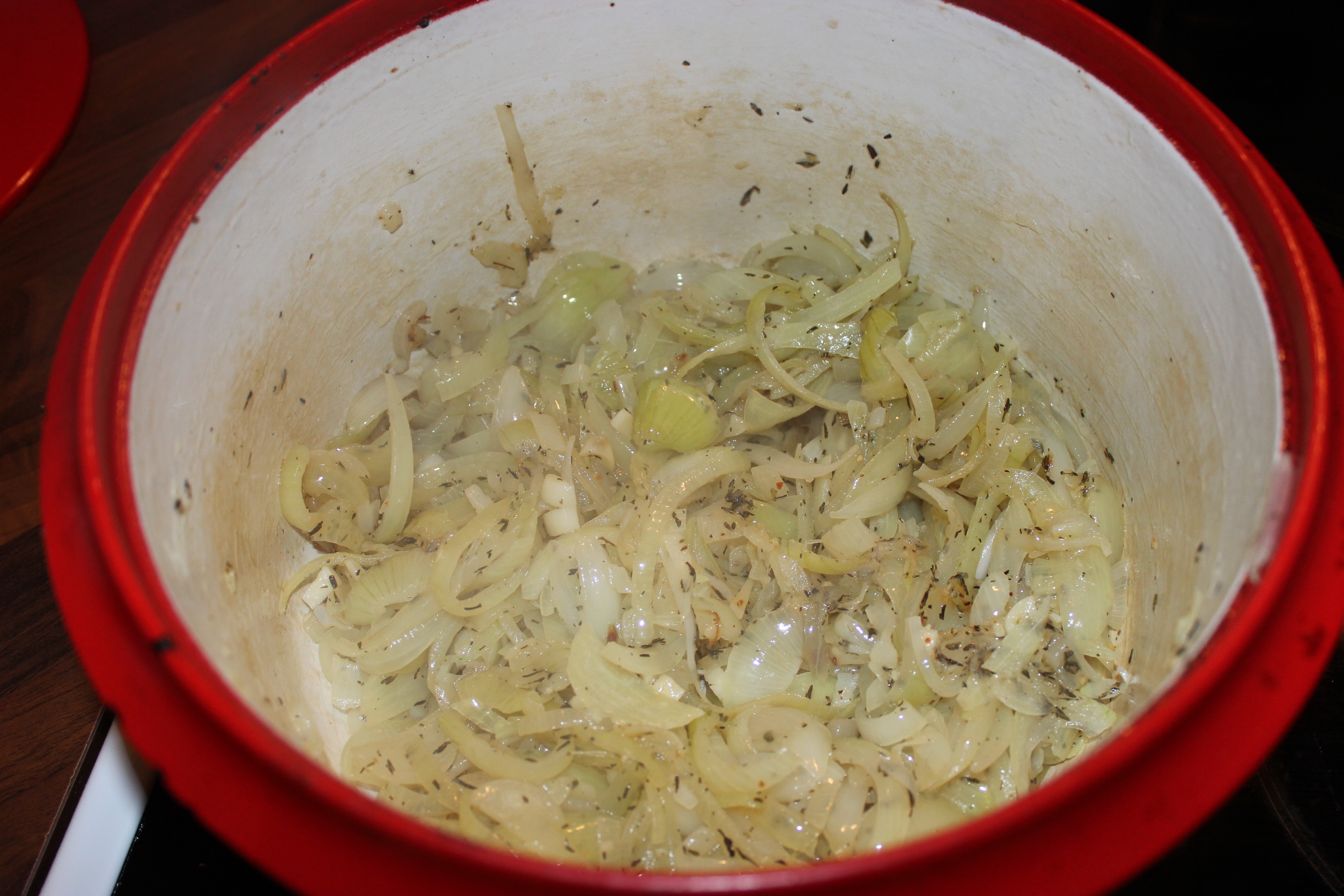 Kaikkihan taas lähtee pilkkomisesta ja kuorimisesta. Sipulit viipaleiksi, isoimmissa kannattaa leikata pois pituutta, muuten ne pitkät luirut on valmiissa keitossa hankalia lusikoida. Paahdetaan padassa sipuleita voissa, maustetaan mustapippurilla ja annetaan pehmentyä ja ruskistua rauhassa 20 minuuttia. Sipulit ei saa palaa mustiksi, ne maistuvat karvailta lopputulemassa. Sekaan makeuta vähän fiiliksen mukaan, minusta hunaja on pehmeämpi, mutta sokerikin käy. Sipuli kyllä makeutuu kypsyessään, mutta lisätty makeus on vähän makuasia. Padassa alkuun sipulimäärä näyttää hurjalta, mutta paahtuessaan, ne menevät neljännekseen rakenteeltaan. Kun sipulimassa on hautunut paahteiseksi, sihauta sekaan viini ja anna hetken imeytyä sipuleihin kunnolla, sitten vesi ja kasvisfondi ja timjami. Sitten vaan antaa keiton hautua miedolla lämmöllä tunnin verran, kansi päällä, ettei nesteet haidu liikaa.