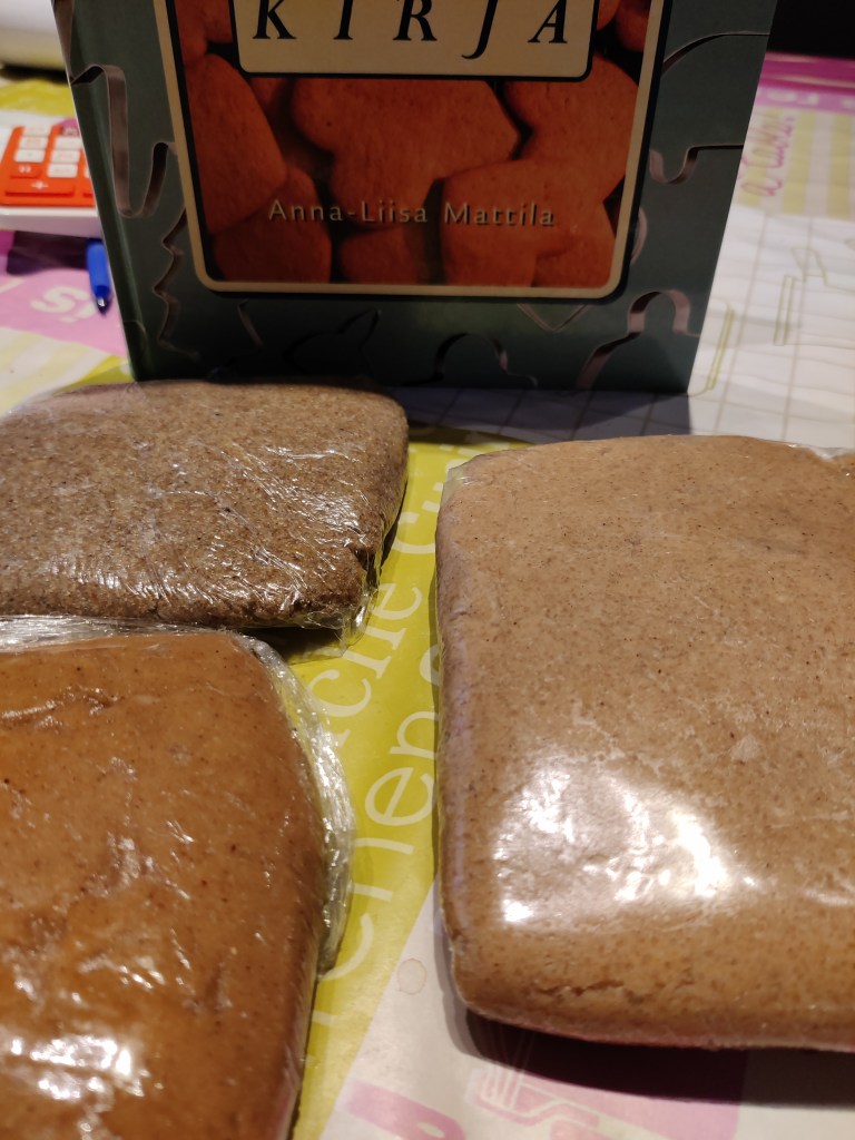 Piparikirja on hieno kooste piparkakkujen maailmana ja kirjan lopussa on parikymmentä erityyyppistä piparkakkuohjetta. Miä en tällä kertaa etsinyt täydellistä piparkakkutaikinaa, vaan eri versioita samasta aiheesta. Poimin kolme erilaista piparkakkua kirjasta. En laita tähän suoraan resptejä tai kaikkia tarveaineita, kunnia kirjan oikeuksien haltijalle, vaikka minun second hand- kirjaostokseni provikat eivät taida enää kirjoittajalle saakka ylettyä. Mutta Itsenäisyyspäivän viikonloppuna oli mukavan rentoa vapaata askarrella taas hetki keittiössä. Piparkakkutaikinat tehdään yleensä aina edellisenä päivnä, taikina on paremman makuista ja leipoutuu hyvin kun saa levätä. Piparikirjan ohjeet olivat määrältään kyllä melko meseviä… 1 dl vehnäjauhoa tai 500 g siirappia jne.. enhän minä voi tässä testiprojektissa noin suuria määriä tehdä taikinaa. Joten pienensin kaikki 1/4 osiiin, kun yhteensä teen kuitenkin kolme taikinaa.