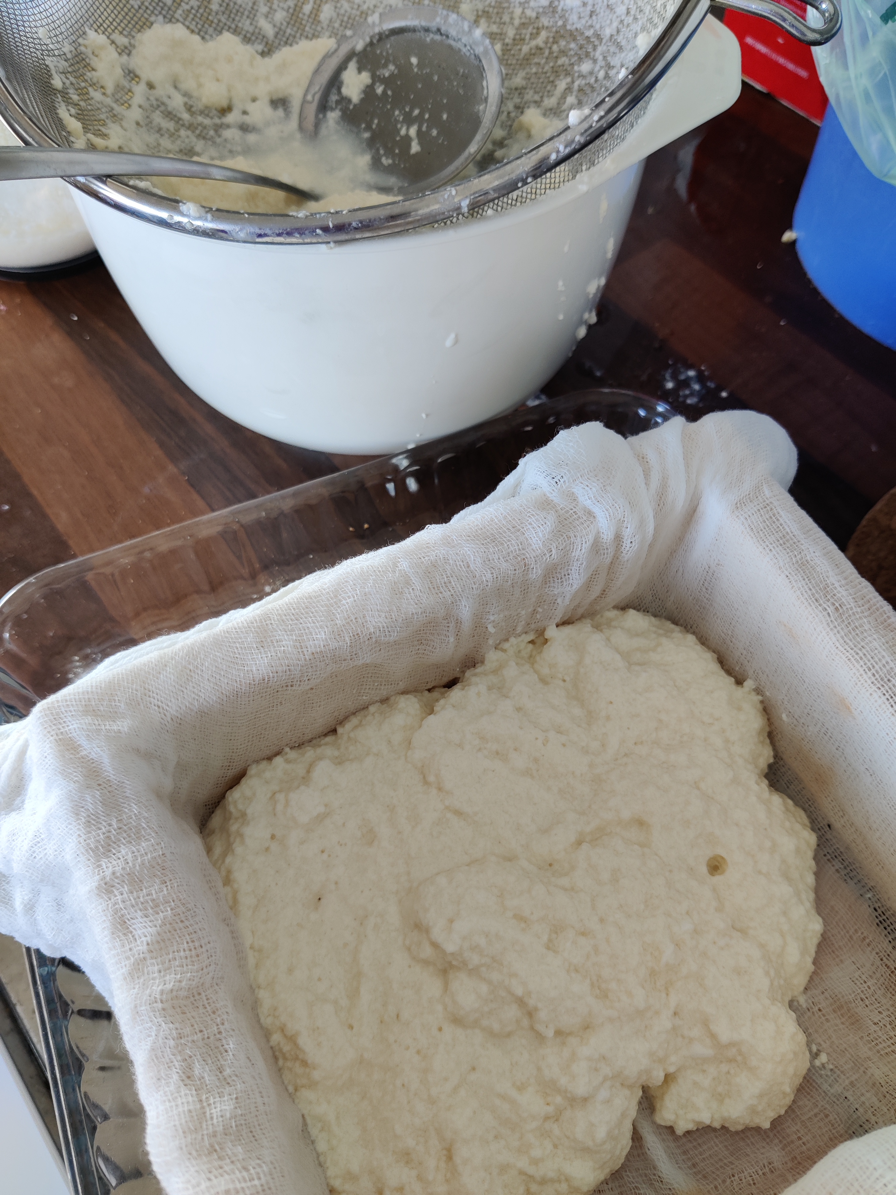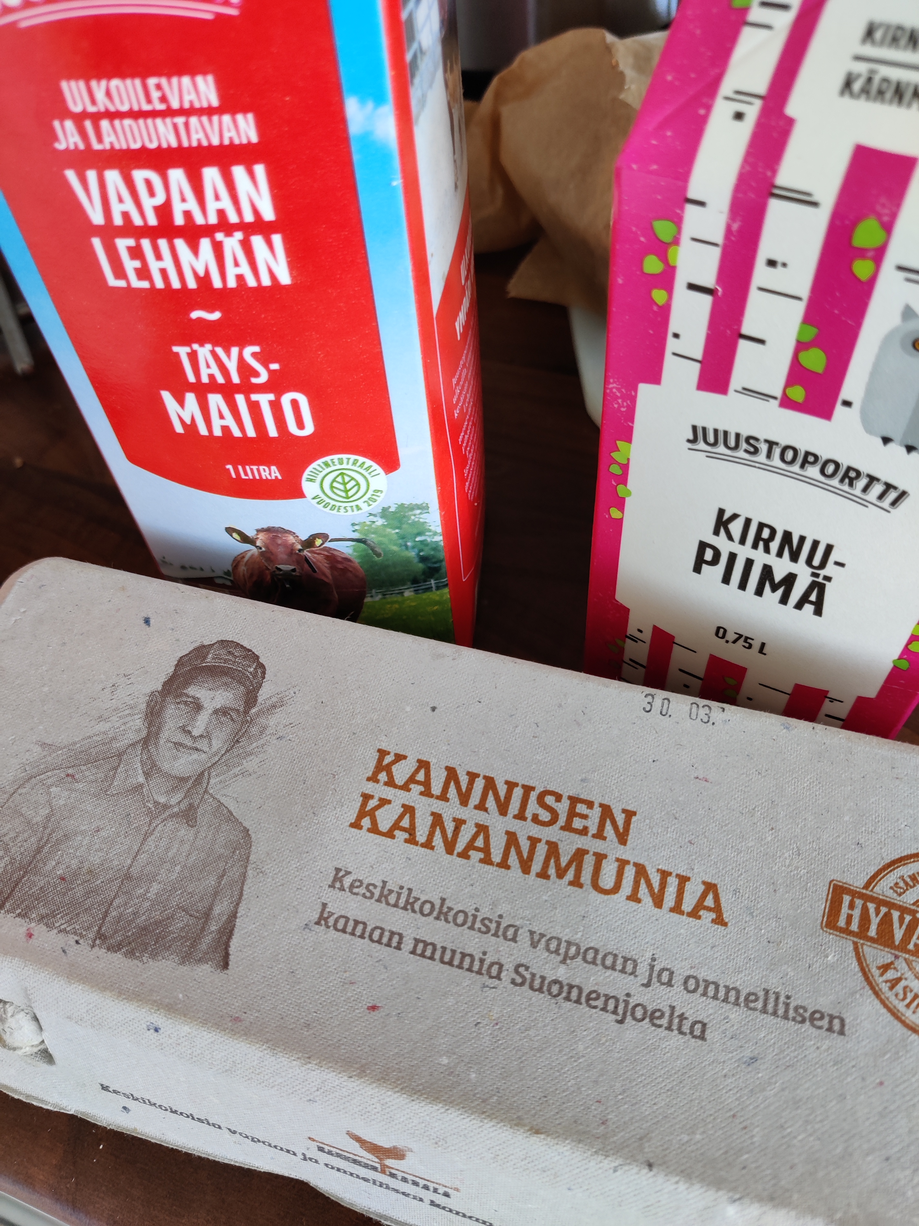 Tarvitaan siis 3 litraa täyskulutusmaitoa, kokeneemmat sanovat, että laktoosittomuuskäsittely suomalaisessa maidossa häiritsee laktoosittoman tuorejuuston prosessia. Otin siis neuvosta vinkin, ja tein tämän ns normimaitoon. Kaupoissa myytävät laktoosittomat pitkään kypsyneet juustot ovat saaneet laktoosittomuutensa tuon kyseisen kypsytyksen aikana, laktoosi sokeriyhdisteenä hajoaa hiljalleen 3-4 kk kypsytyksessä omin voimin. Piimästä luin kommentteja, ettei saa olla mitään funktionaalisesti paranneltua ab-piimää etc- versiota eikä rasvatonta, joten etsin piimästäkin mahdollisimman originaalin tuotteen kaupasta. Piimää tarvittiiin litra ja tähän nestemäärään nähden 3 kananmunaa, 1 tl suolaa ja 1 tl sokeria.