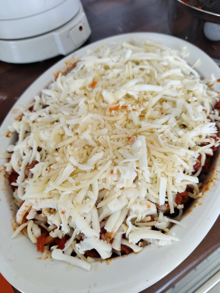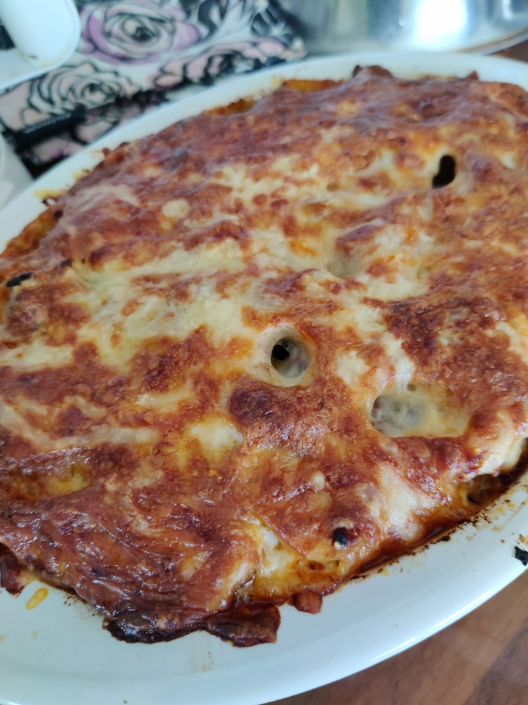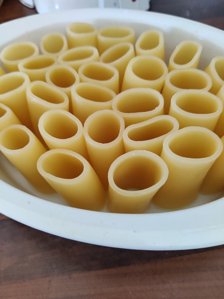 Nyt tässä versiossa on kyse tarjoilumuodosta. Jossain johonkin tämäntapaiseen taas törmäsin ja idea jäi vaivaamaan jotain ruokaoasastoa muistilohkoissani. Erikoispastasta tässä on kyse, pitäisi löytää noita isoja puolitötteröputkia… ei ihan löydy jokapaikasta Meni aikaa ja kappas, jossain itseään kunnioittavassa kaupassa oli otettu noita valikoimiin satunnaisesti erä. Heti piti tarttua ja pääsi kokeilemaan. Pidempään mietin rakennetta, esikeitänkö tötteröt ensin, vai riittääkö kastikkeessani nestettä tarpeeksi. Jos tötteröt on liian löysiä, ne notkahtaa täyttövaiheessa. Joten tein kompromissin.. keitin niitä noin kaksi minuuttia väljässä vedessä, ja kastikkeenkin jätin melko juoksevaksi. nopea huuhtelu kylmällä vedellä, jotta putkia pystyi käsittelemään edes jotankuten. Siitä vaan latomaan ne pystyyn reunalliseen vuokaan. sitten kauhoin kastiketta tasaisesti putkiin ja pinnalle. Päälle runsaasti juustoraastetta ja uuniin noin 30 minuuttia 200 asteessa. Nyt laitoin tämän isompaan vuokaan, siitä tuli kolme reilua annosta. Jos minulla olisi ollut korkampireunaisia annosuunivuokia, tämä olisi näyttänyt paremmalta suoraan annoksina paistettuna ja tarjoiltuna.