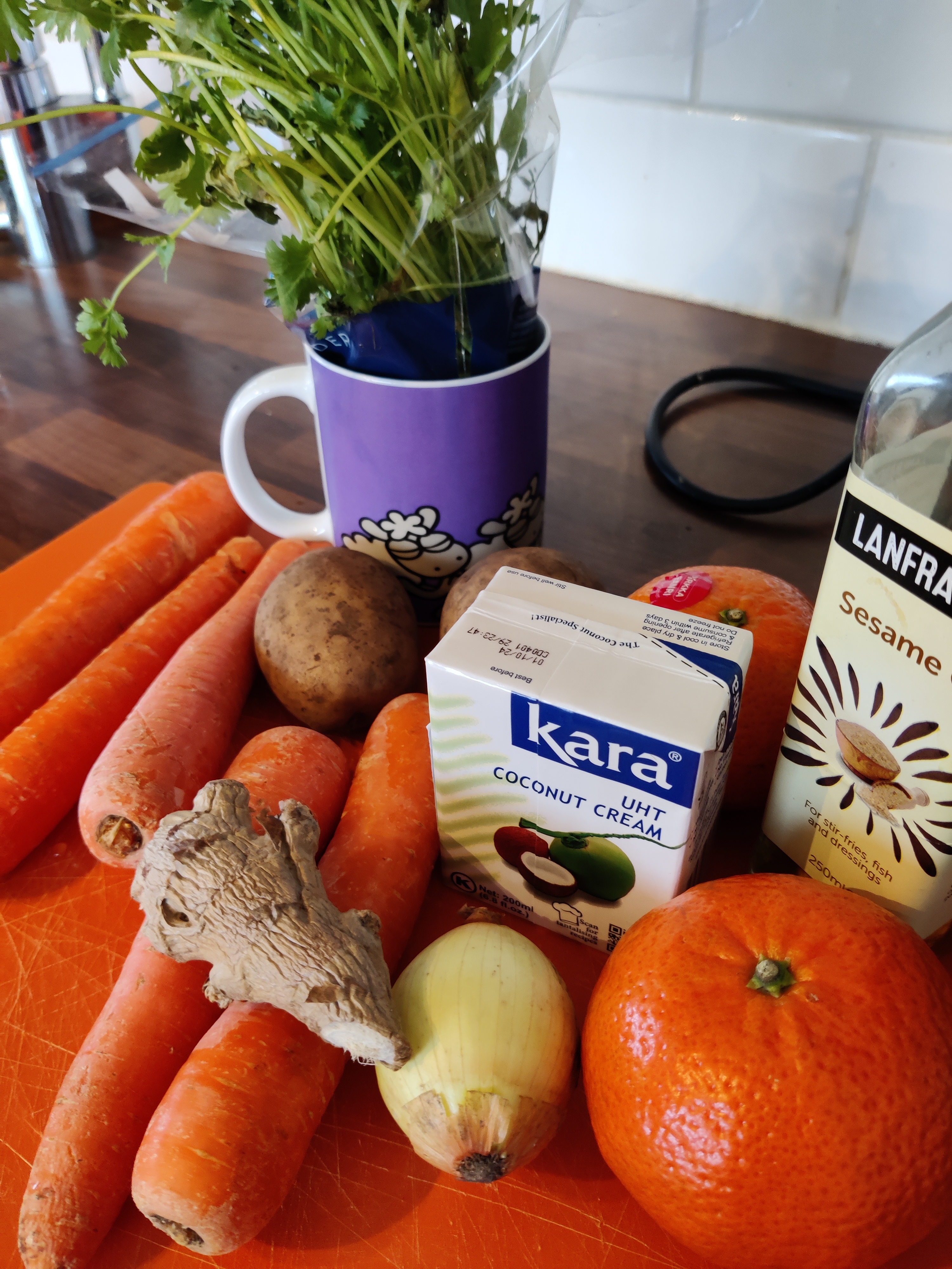 kattilaan vettä ja sinne porkkana, peruna, inkivääri, mandariinipalat, sipuli ja chili. Keitetään kypsäksi, maustetaan perusmausteilla ja soseutetaan sileäksi. Lisätään kookoskerma, tarkasta maku. Asettelu varmaan teki tällä kertaa ruuasta fiinimmän kuin ruokatalouteni ”normi” lounaskeitto. Keittoa lautaselle, pinnalle korianteria, taiteellinen loraus pähkinäöljyä ja loput tuoreet chilipalat. Keitto oli mausteinen, hieman tulinen, mutta sattuipa hyvä tasapaino makupaletissa, yllätin kyllä hieman itseänikin tällä kertaa. Idea makeammasta komponentista, mandariinista oli toimiva.
