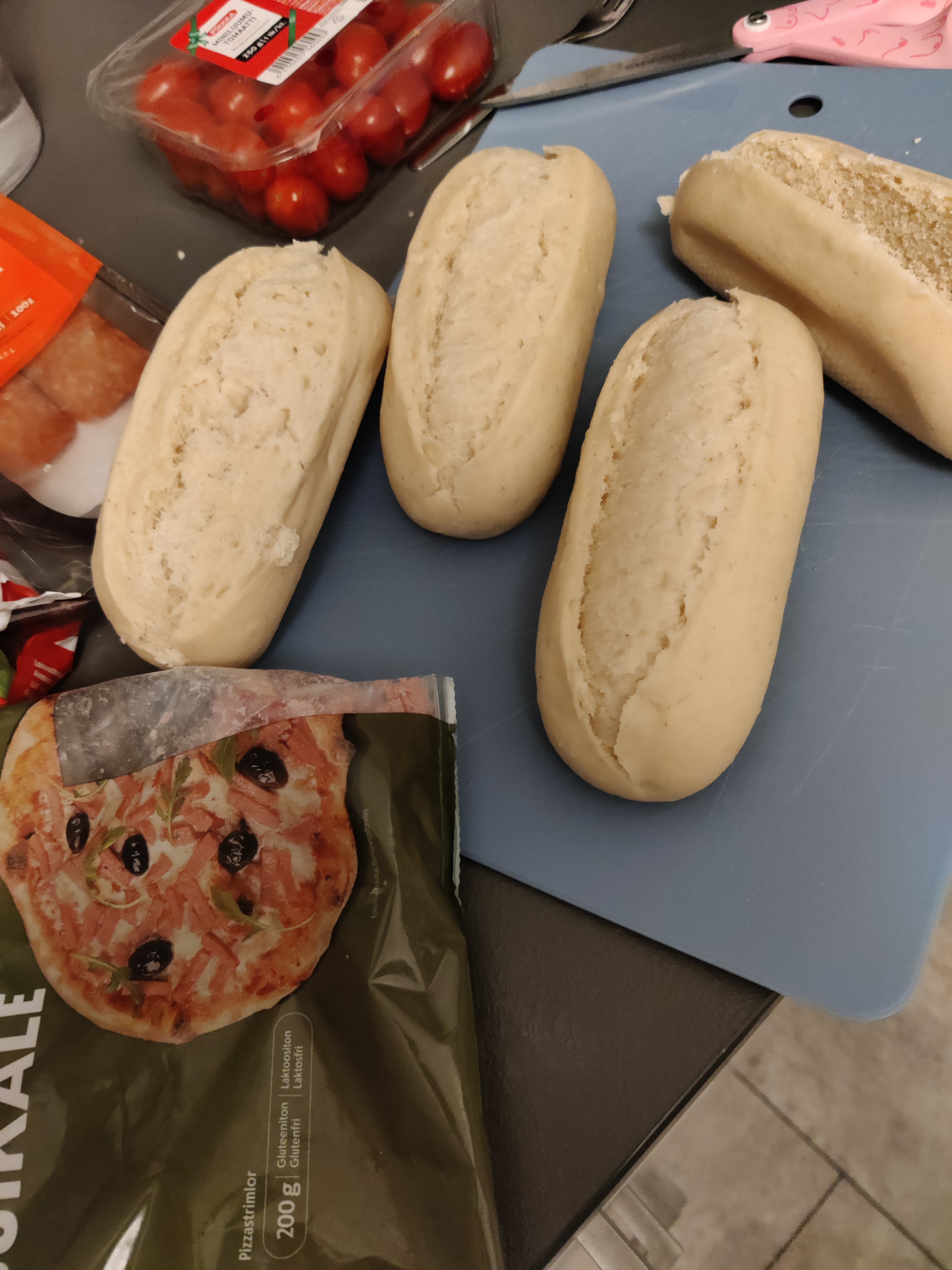 En käytä useinkaan noita esipaistettuja patonkeja tai sämpylöitä, pitäisi kai käyttää, kun en osaa leipoakaan., heh. Tuotehan on tosiaan esipaistettu, ja sitten kaasuun pakattu, säilyvyyttä parisen kuukautta huoneenlämmössä. Leipä tarvitsee loppuvalmistukseen uunissa noin 10 minuutin paiston ja vot, sinulla on ns tuoretta leipää tarjolla, eihän se huono idea ole ollenkaan. Kerran kaupassa käydessäni minua jäi vaivaamaan sana esipaistettu ja pari viikkoa kun joutessani asiaa pohdin ja pyörittelin, pitihän se kokeilla.. eli voiko tuollaisen tuotteen täyttää ja paistaa sellaisenaan kypsäksi. Jos tekee ns läpi kypsästä sämpylästä vastaavan, se on itsessään jo kuiva tuote ja kuivaa ehkä liikaa täytettynä, raakaan taikinaan ei tietenkään voi täytteitä laittaa, tai sitten taikinan pitää olla ihan ohut ja sitä sitten kutsutaan esim pizzaksi, (no johan, tässä alkaa ihan vitsejä vääntämään).