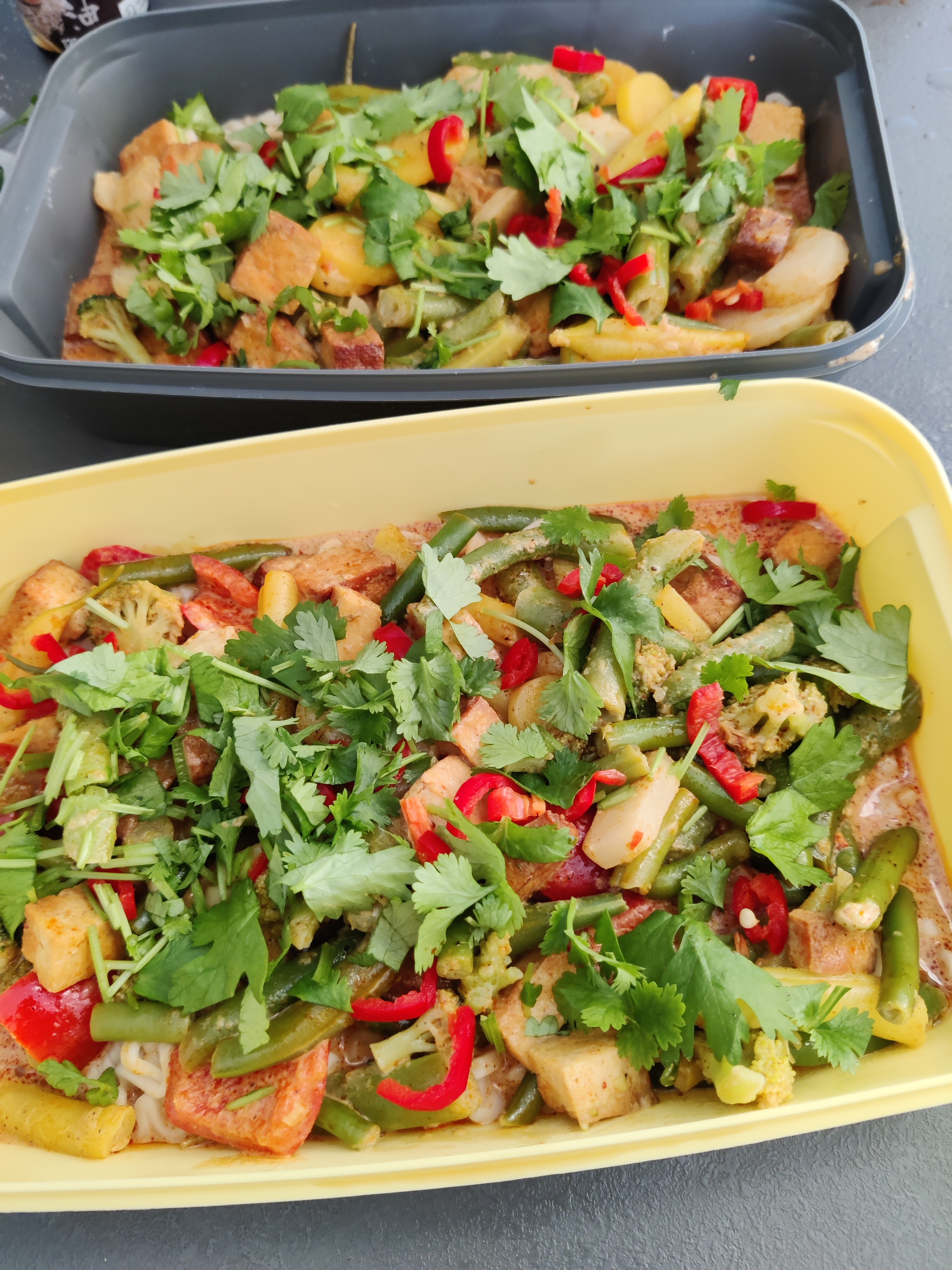 tämän tyyppinne keitto kasaantuu isoon kattilaan ihan lisäämällä ne kypsymisjärjestyksessä. Valmis chilikastike tuo itämaista makumaailmaa ja lisää sitten oman maun mukaan, minulle sitruuna, tuore korianteri ja chili ovat niitä viimeistelyssä. Purkki kookoskermaa maustaa lientä ja nuudelit tuovat ruokaan täyttävyyttä. Laskeskelin raaka-aineita yhteen ja tästä tuli neljä isoa annosta, annoshinta oli noin 3 euroa, kalleimmat yksiköt olivat tofu ja tuore korianteri