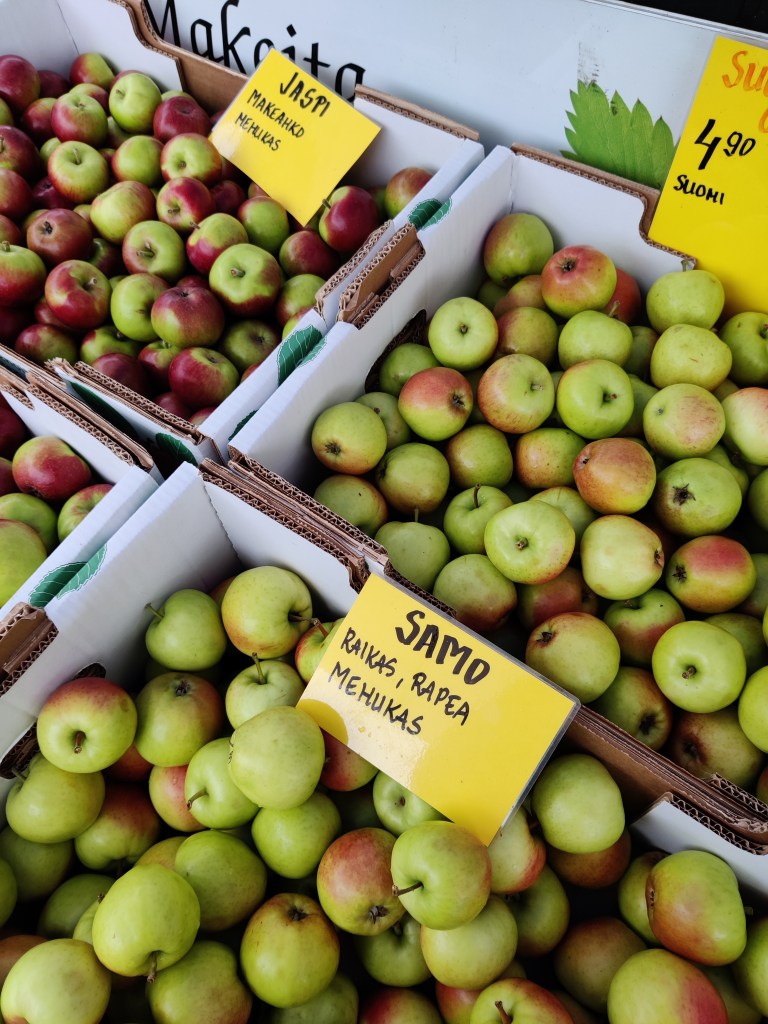 Nyt kun pyrin kirjoittamaan omaan ruokamieleeni osuvia sesongin poimintoja, syksyn upea herkku, kotimainen omena saakoon sen ensimmäisen kirjoituksen. Elokuussa on jo jotain varhaisia lajikkeita, mutta näin syyskuun alusta marras- joulukuulle saakka on tarjolla kotimaista omenaa. En oikeastaan syö omenoita kotimaisen sadon ulkopuolella, happaman ystävänä Granny Smith on mieleinen lajike tai rapeat honey crisp – omenat.