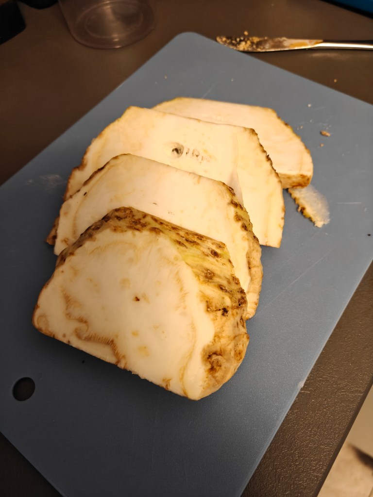 Kaupasta löytyy kokonaisia (toki puolikkaallakin pärjää) mukulasellereitä. Olen käyttänyt selleriä uunijuureksena tai Waldorfin-salaatin raaka-aineena. Olen tehnyt joskus aikaisemminkin, mutta nyt taas innostuin ja tein itse asiassa kahteen kertaan selleristä pihvejä. Eivät kyllä ole täysin vegaanisia, mutta sitähän minä en erityisesti vaadi ruokiini, jos sattuu kohdilleen, voi olla ihan umpi vegaaninen. Nämä pihvit eivät ole, koska vahvaan panerointiin tarvitaan minun keittiössäni kananmunaa ja paistamiseen voita. Kun tuunasin kakkosversion näistä pihveistä, lisäsin panerointiseokseen pecorinoraastetta ja nyt toimi täydellisesti.